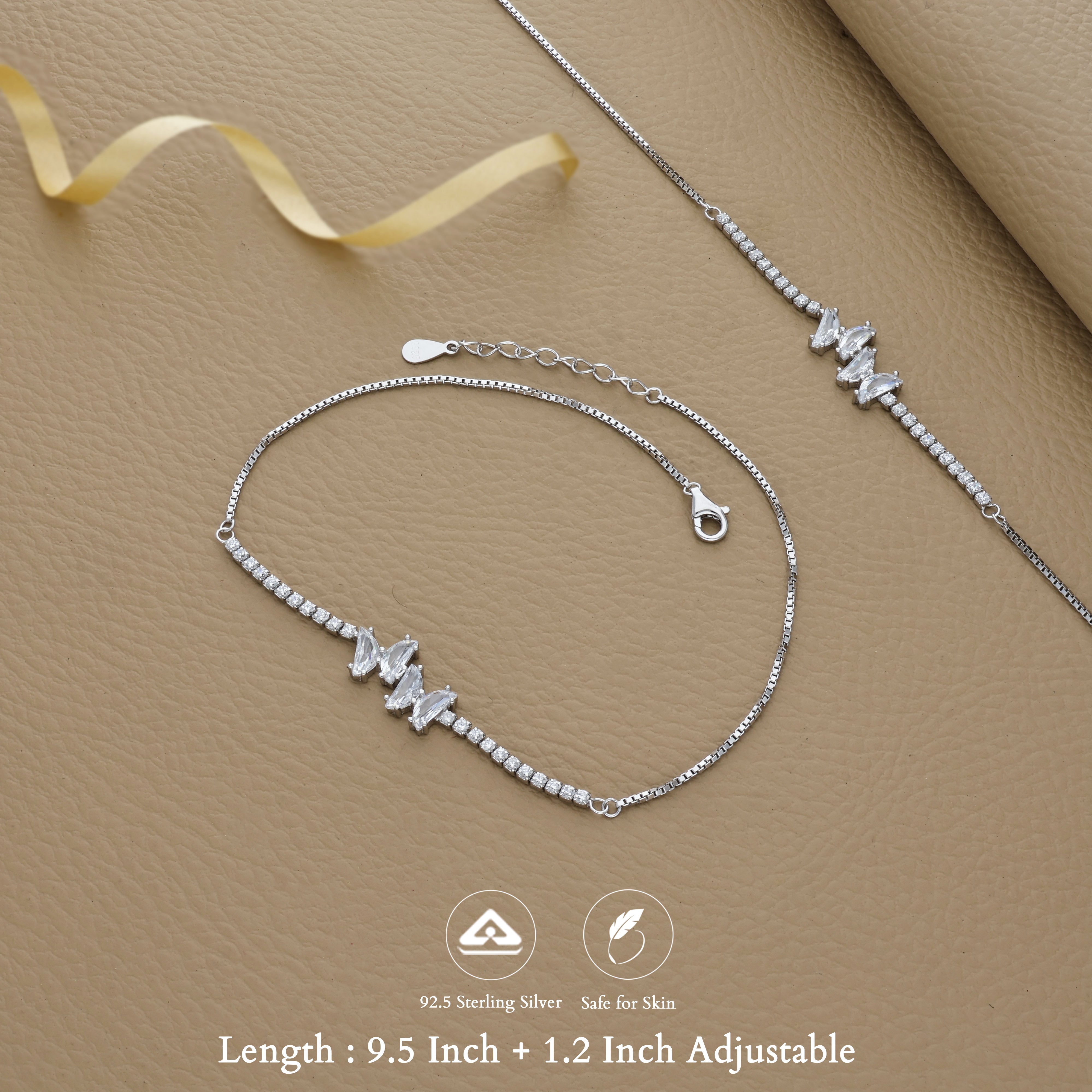 Delicate and enchanting, this anklet features a charming butterfly motif crafted in pure 92.5 silver with hallmark authenticity. Finished with a radiant rhodium polish, it is hypoallergenic and gentle on the skin, ensuring lasting shine and comfort. A graceful pair that adds elegance and sparkle to every step, perfect for daily wear or special occasions.