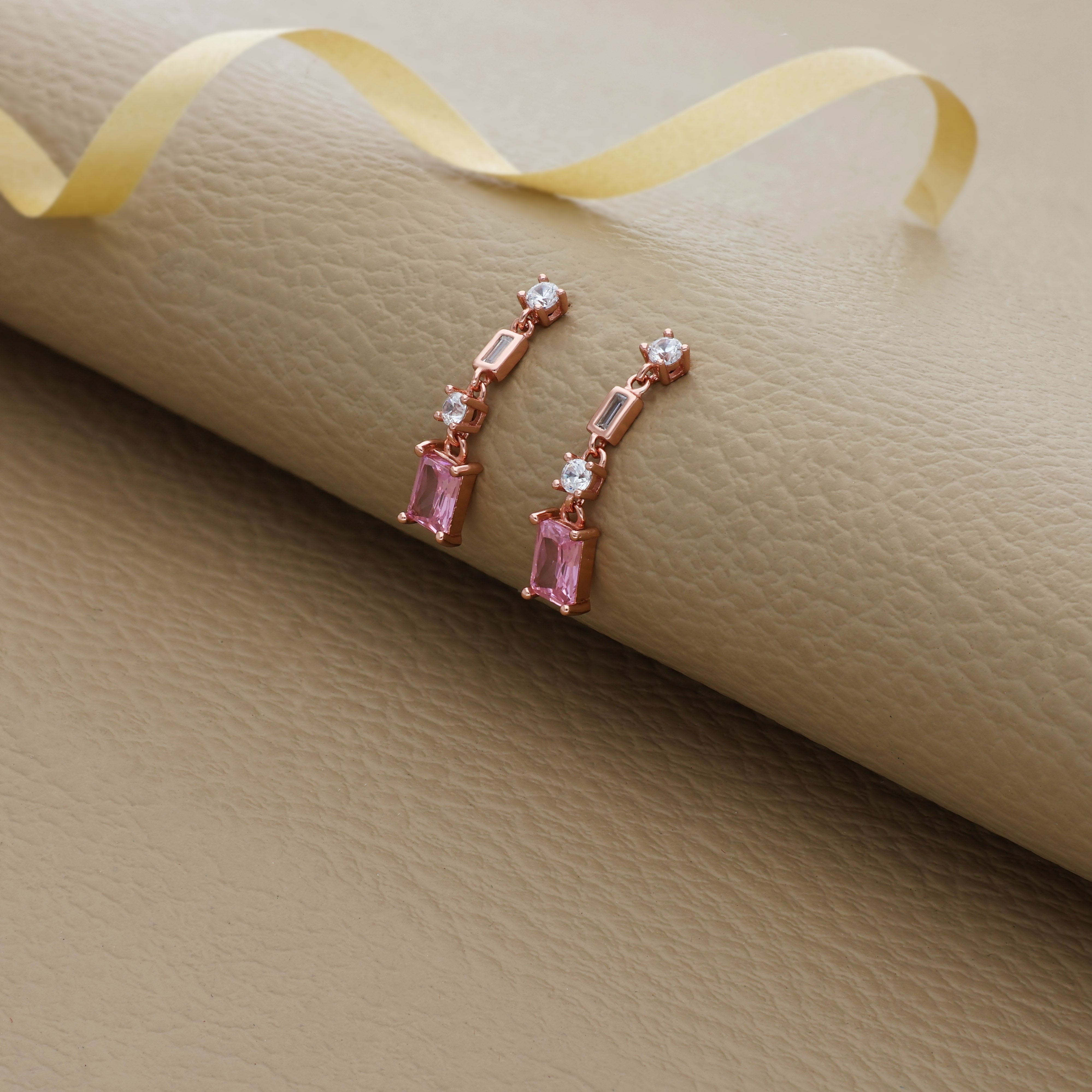 Embrace subtle sophistication with the Linear Pink Rose Gold Drop Earring, its sleek linear design is accented with delicate pink zircon stones for a gentle sparkle. Gentle on the skin and designed for comfort, this piece adds a refined, feminine charm to any outfit.