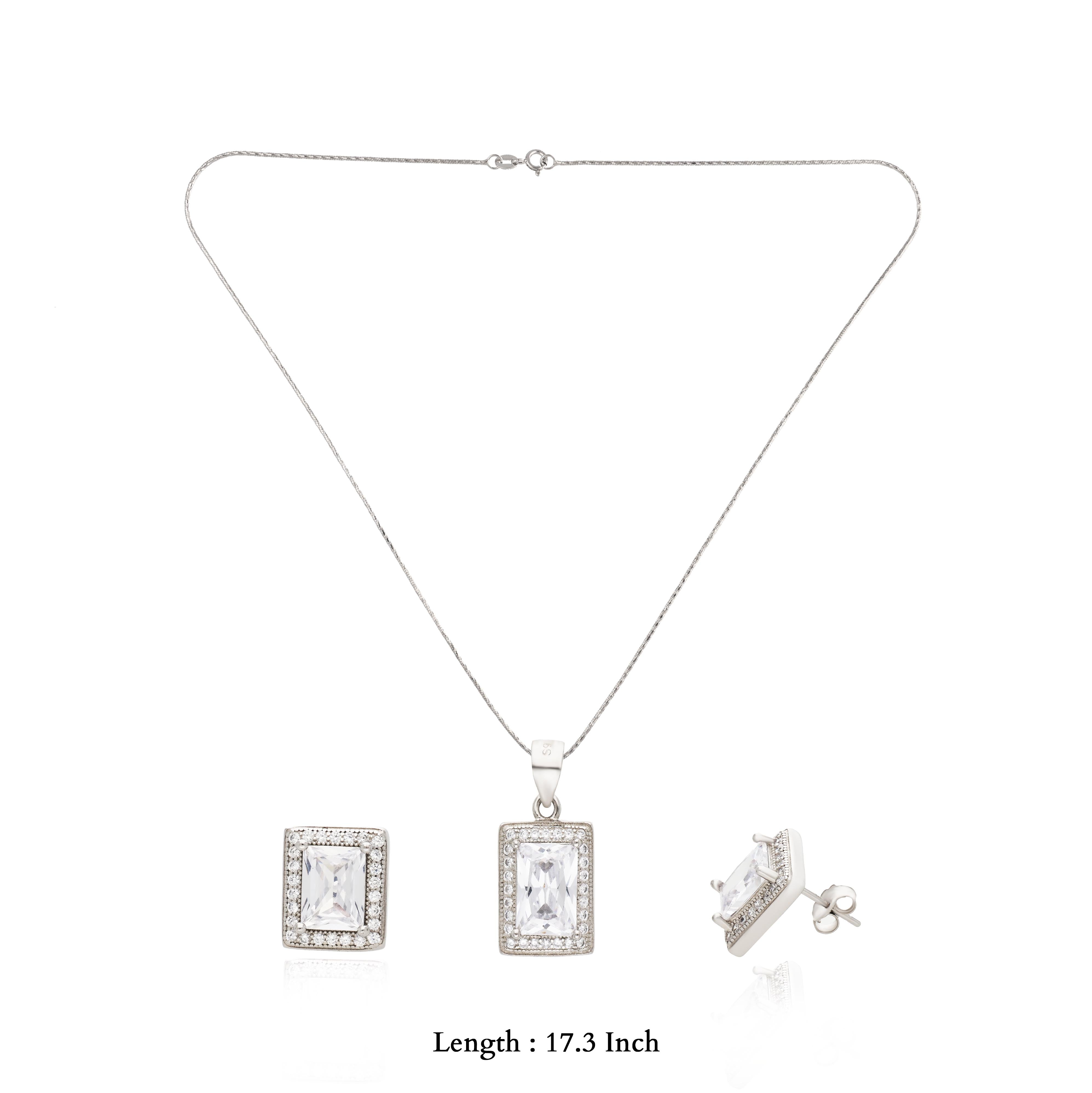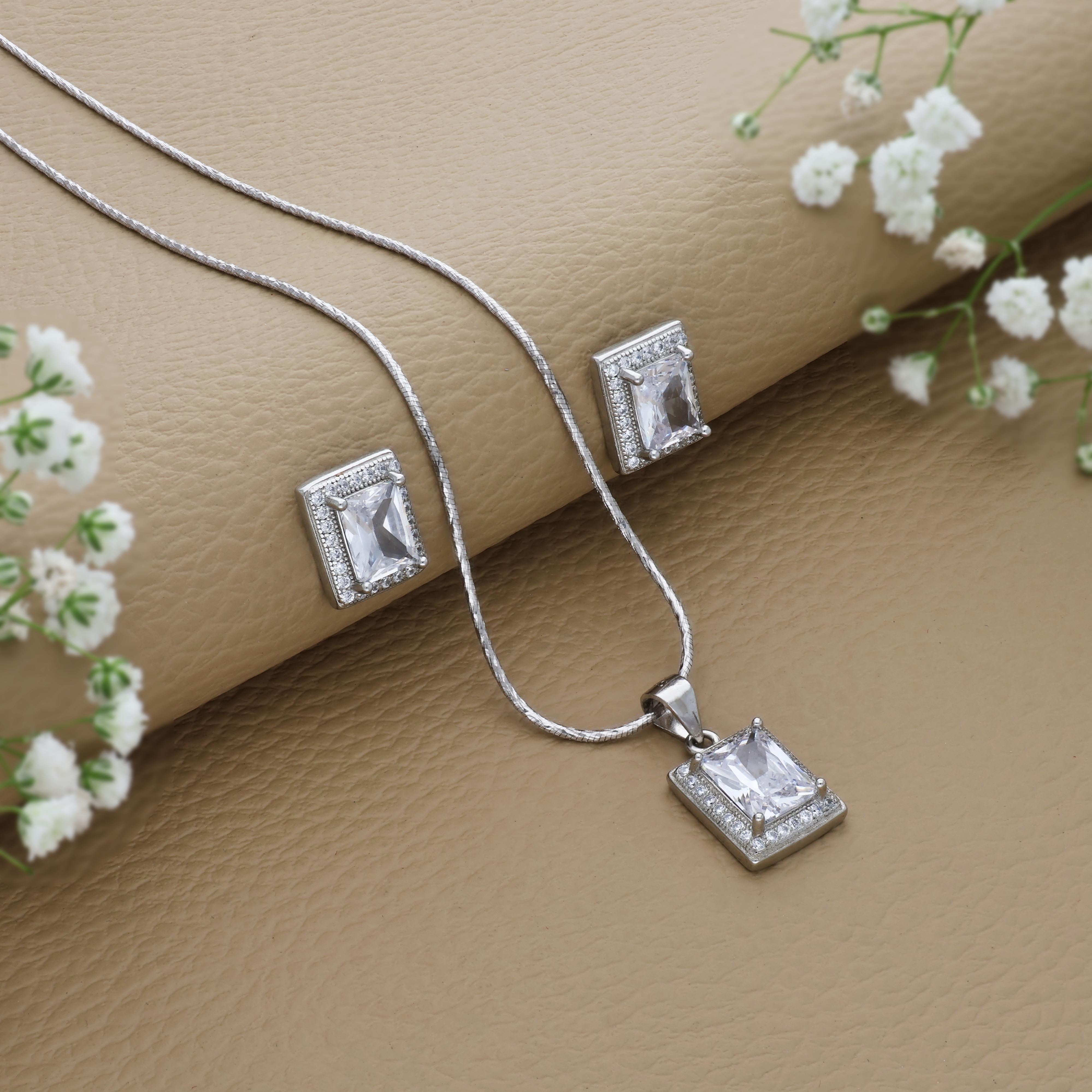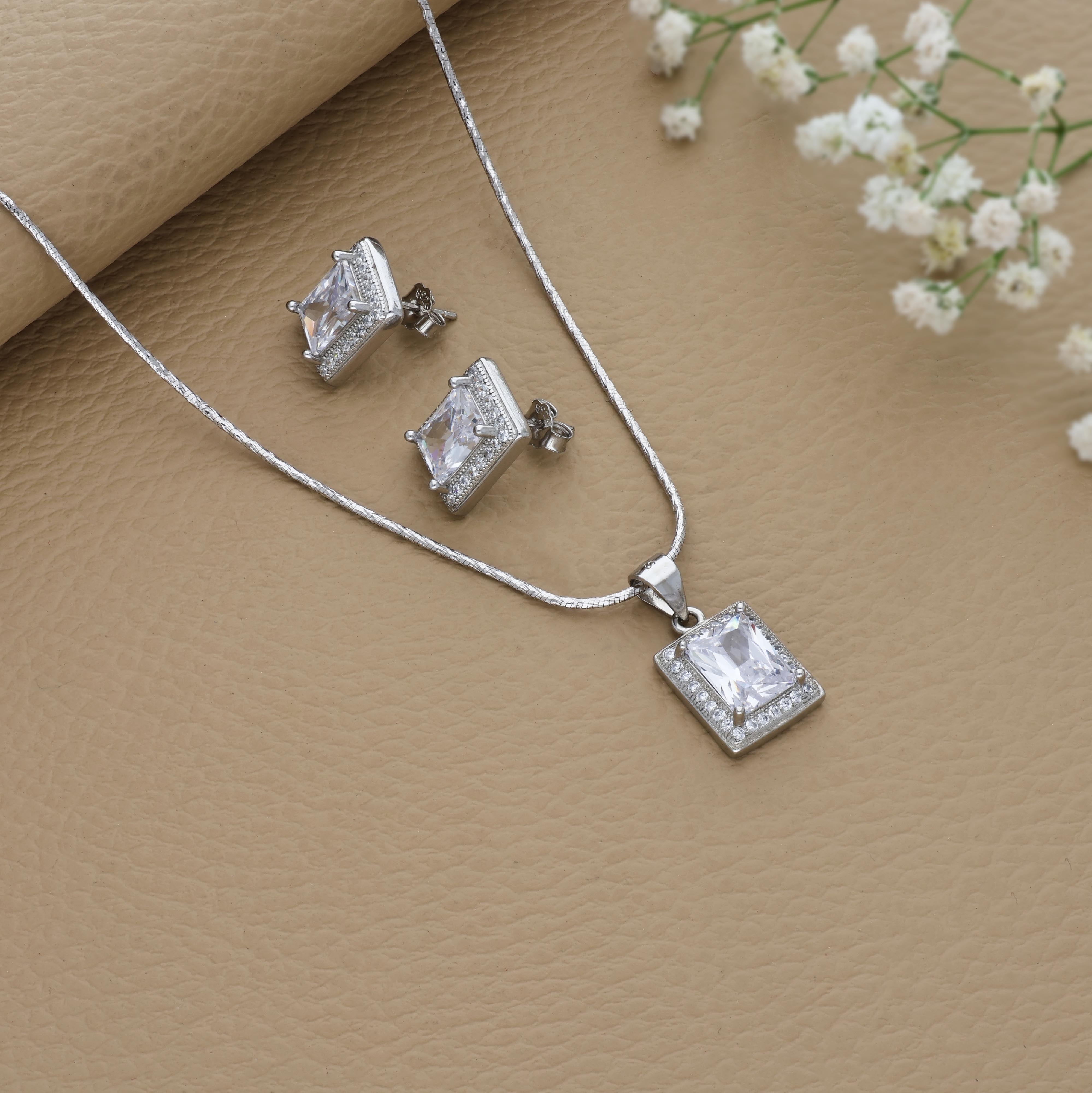 • Radiate sophistication with the Elegant White Square Silver Pendant Set. Featuring high-quality white zircon stones in a classic square design, this set includes one stunning pendant and a matching pair of studs for a polished, coordinated look. Skin-friendly and revaluable, the price includes both the pendant and studs, making it ideal for women and teens who love timeless elegance with a modern touch.