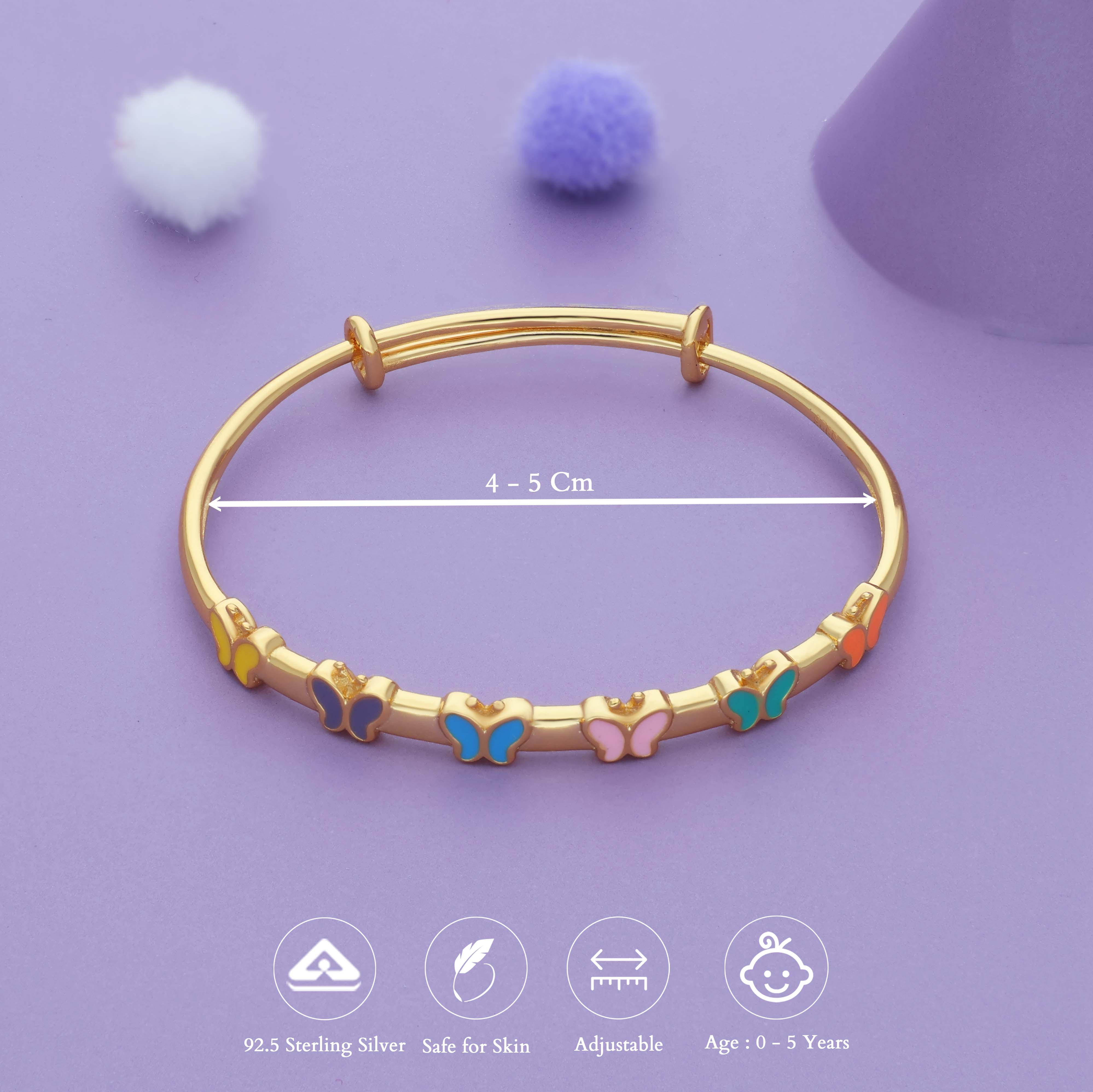 Watch your little one shine with the Golden Flutter Silver Bangle, a charming creation that captures the magic of childhood. This bangle comes with a premium 18K gold polish and 18K gold plating, offering a rich, long-lasting glow Adorned with delicate butterfly motifs, it beautifully reflects joy, innocence, and playfulness in every tiny detail.