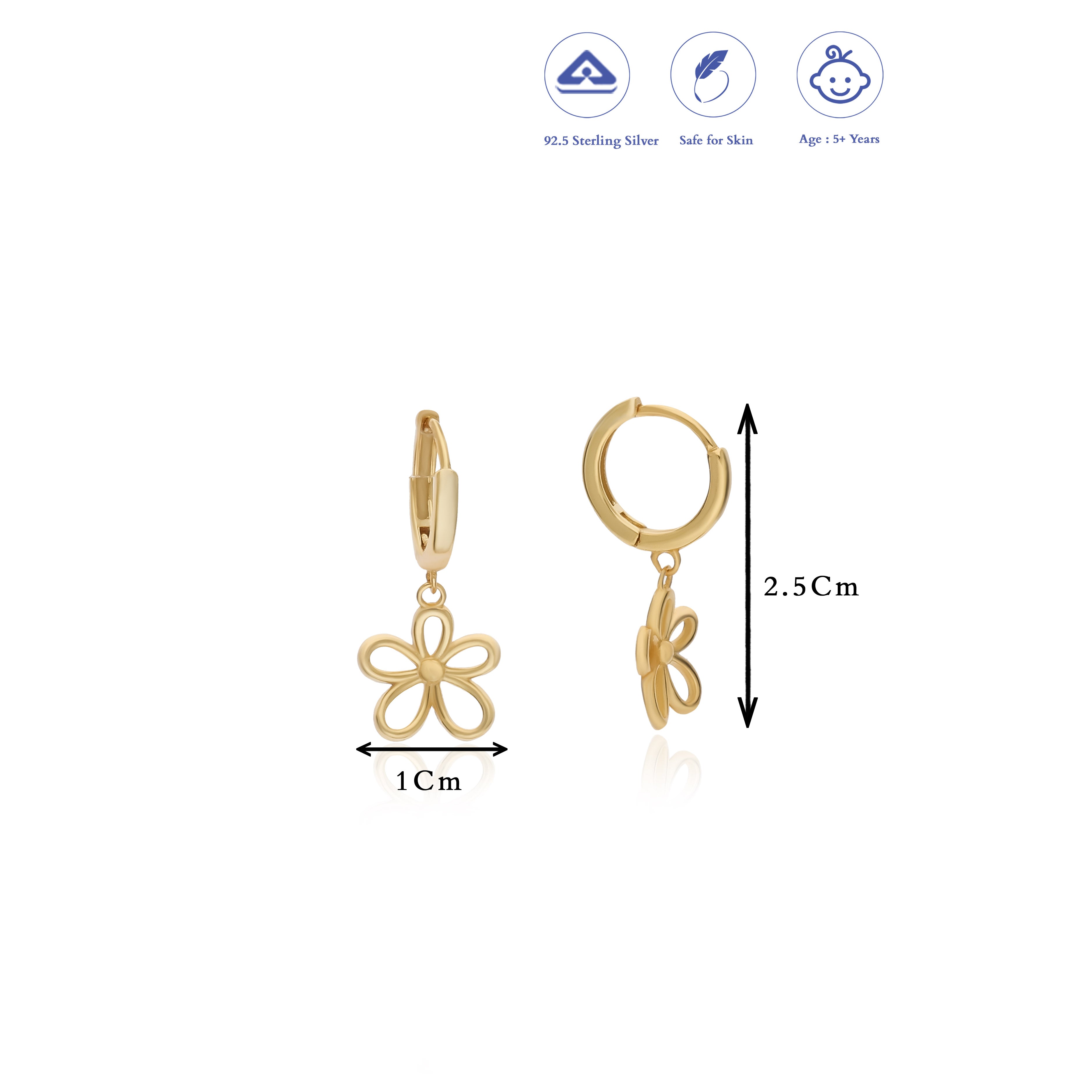 Full of cheer and charm, the Flower Joy Hoop blooms with the happiness of little smiles. Its delicate floral design gleams with a premium 18K gold polish, bringing a soft golden glow that lasts. Lightweight, skin-friendly, and made for everyday sparkle, this beautiful pair is perfect for kids aged 5 and above.
