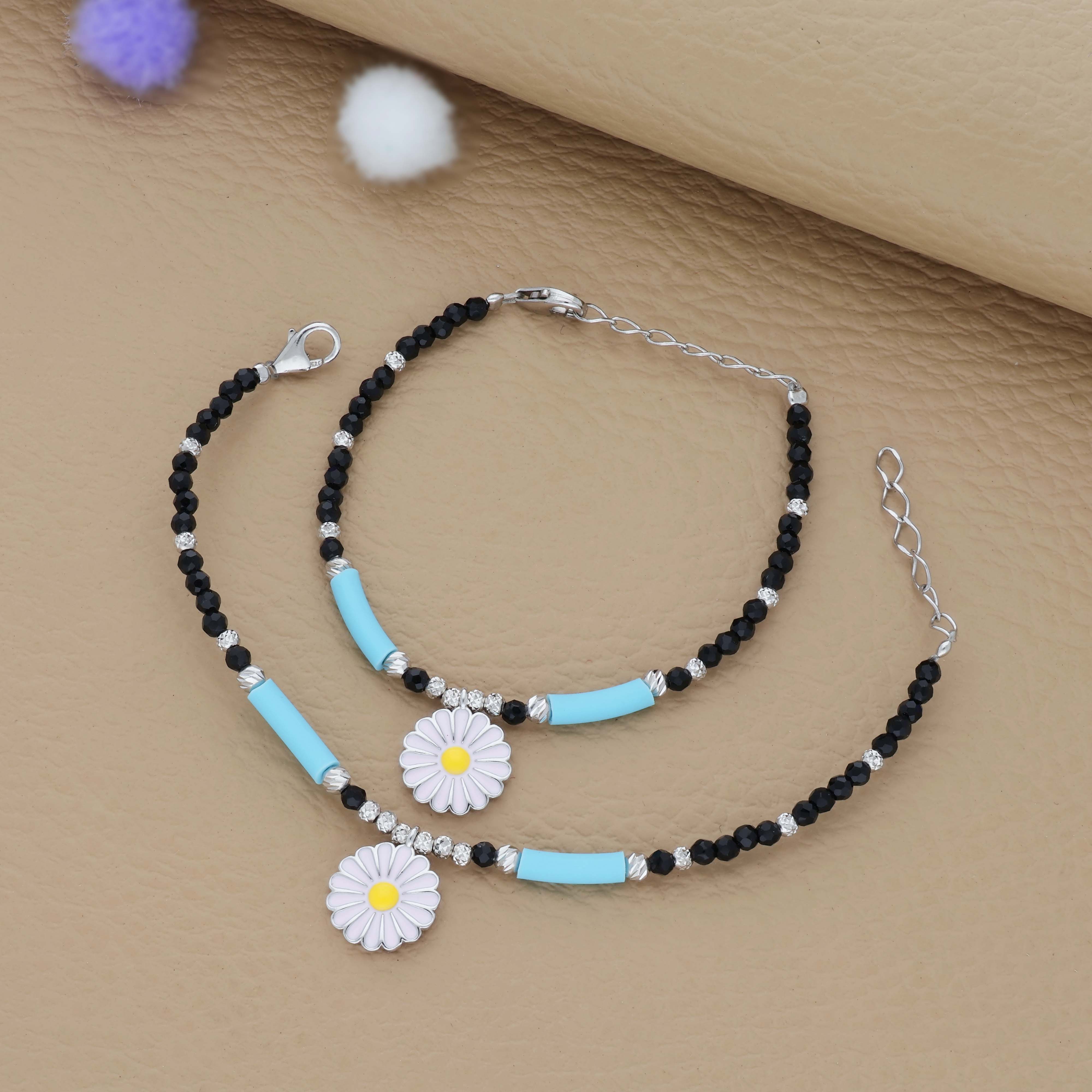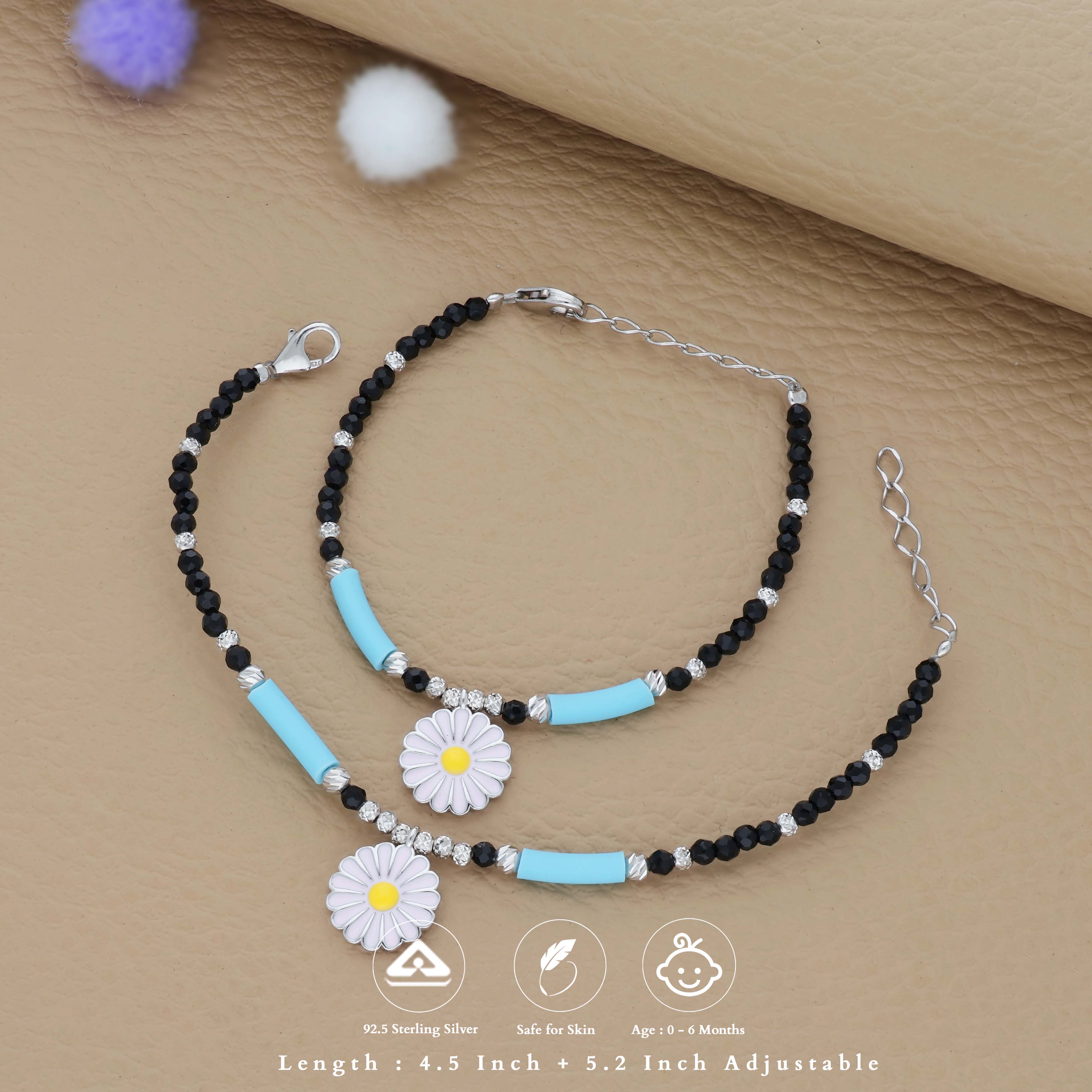 Delicate and charming, the Blossom Bliss Silver Kid Nazariya is designed to bring a touch of floral beauty to your little one’s tiny hands. Featuring smooth silver beads paired with soft, blossom-inspired accents, it offers both protection and style in a gentle, baby-safe design. Lightweight and comfortable for everyday wear, this nazariya adds a sweet, elegant glow—perfect for newborn gifting, celebrations, and daily tradition