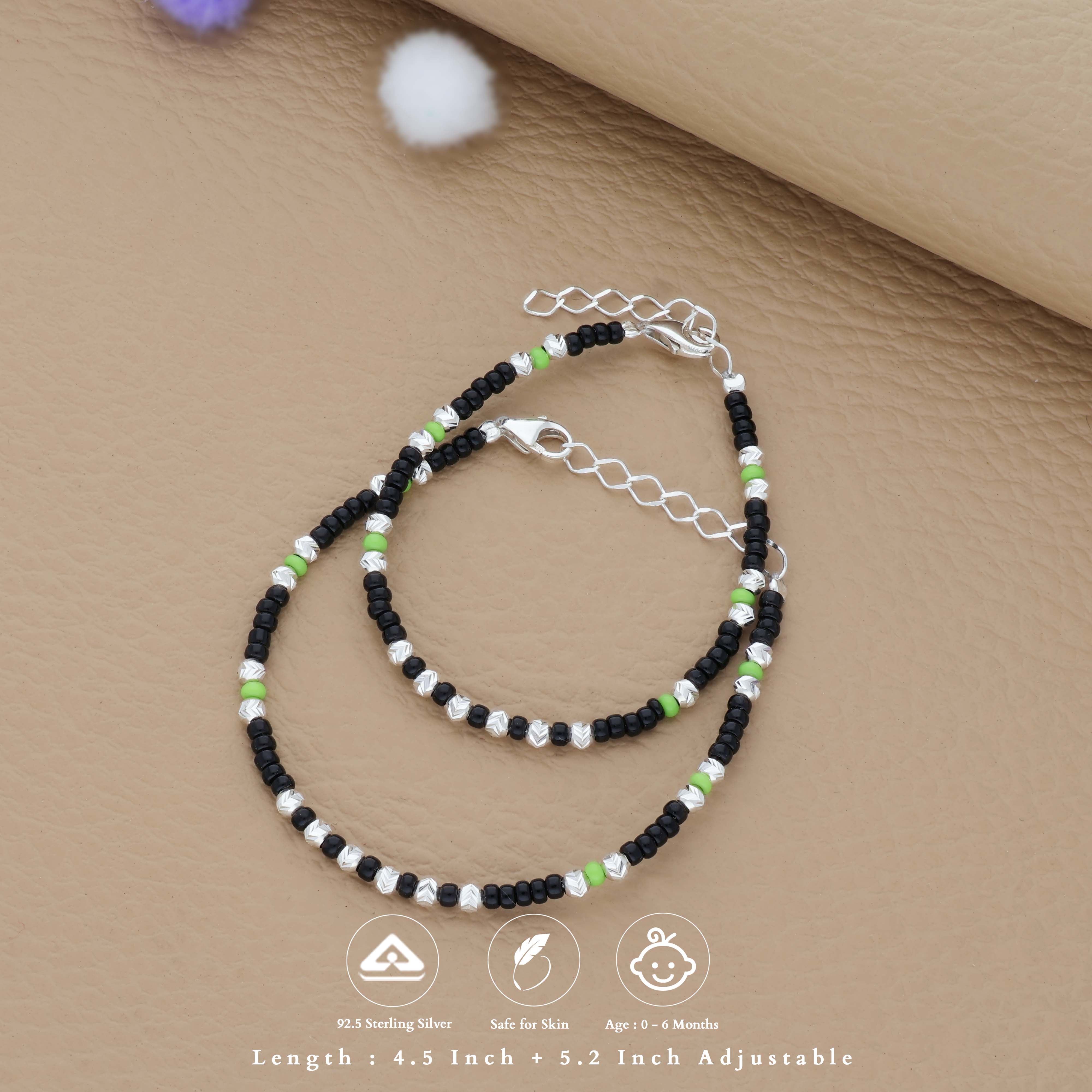 The GreenBead Classic Silver Kid Nazariya features soothing green beads paired with premium silver elements, offering a timeless blend of tradition and simplicity. Lightweight, gentle, and crafted to be baby-safe, it brings a touch of calmness and protection to your little one’s tiny hand. Perfect for everyday wear, newborn gifting, and special moments, this nazariya adds a classic, meaningful charm to your baby’s look.