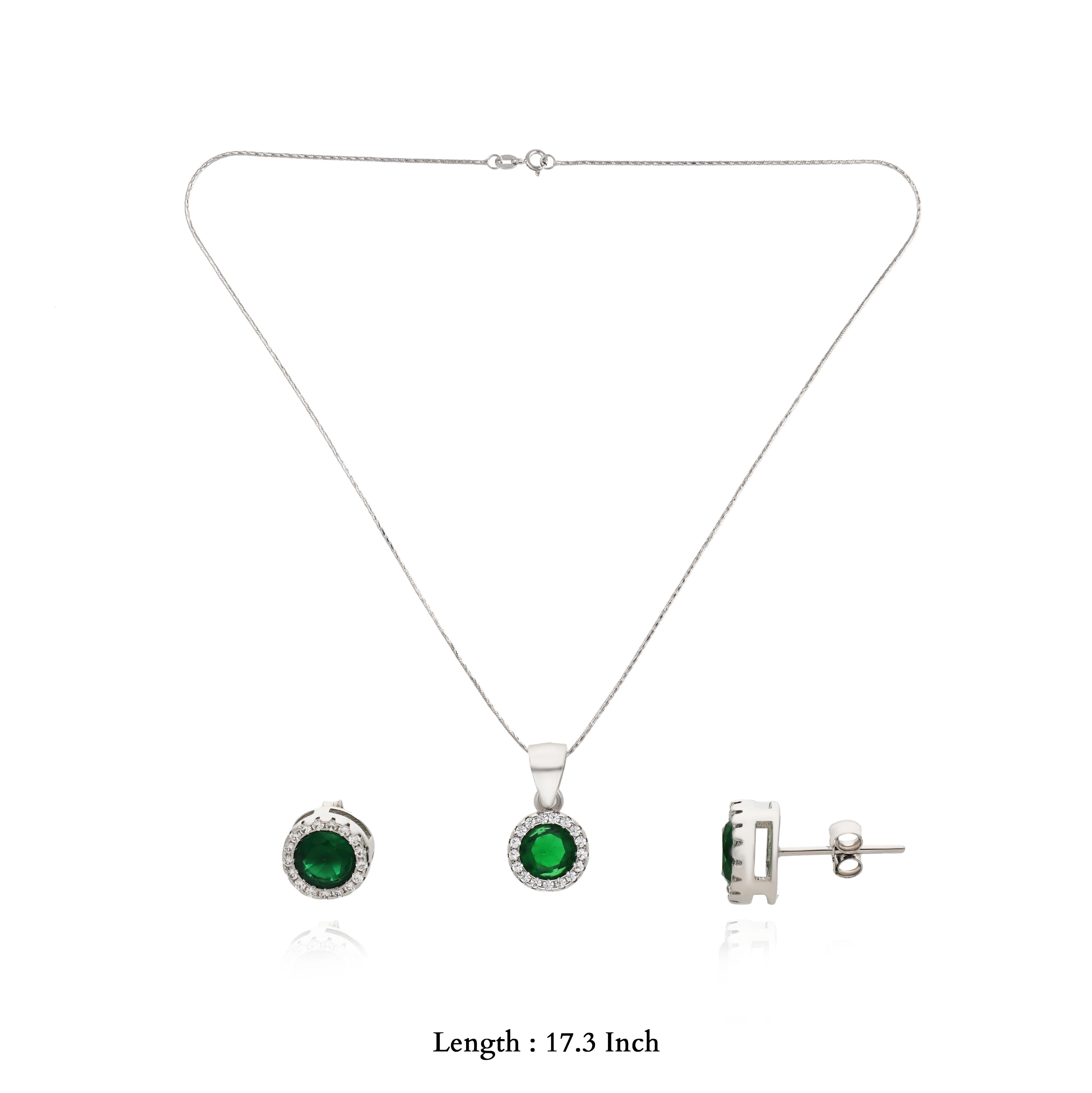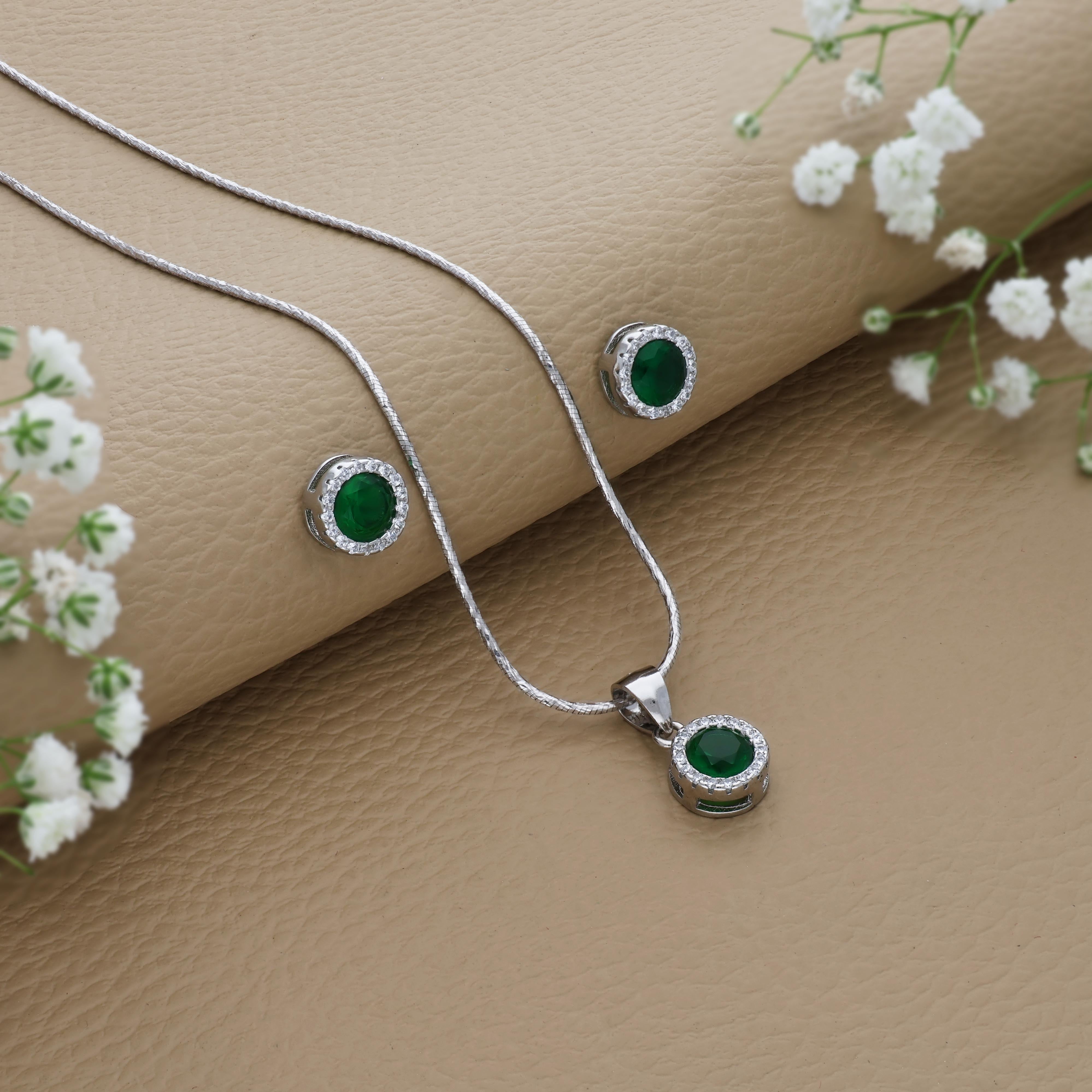 • Add a refreshing touch to your style with the Glowing Green Circle Silver Pendant Set. Adorned with high-quality green zircon stones in a classic circular design, this set includes one pendant and a matching pair of studs for a perfectly coordinated look. Skin-friendly and revaluable, it’s ideal for women and teens who love timeless elegance with a vibrant sparkle.